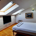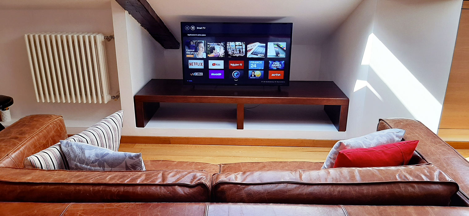 L’arredamento in stile Vintage si sposa elegantemente con il parquet in legno di Ciliegio. Il divano, in pelle, si trasforma in un comodo divano-letto a doppia piazza. Le travi in legno originali da soffitto arricchiscono l’arredamento e completano lo stile unico del Cielo di Napoli. Durante i giorni di pioggia ci si può rilassare con la Smart TV 52” sempre connessa ad internet. Grazie alla connessione in fibra adsl 100 gb è possibile godere al massimo lo streaming.